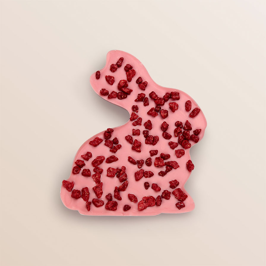 Ca. 80g, aus Erdbeer-Schokolade mit Erdbeer-Crispis, glutenfrei, Kakao mind: 30% Gesamtfett 36%, mit Farbstoff